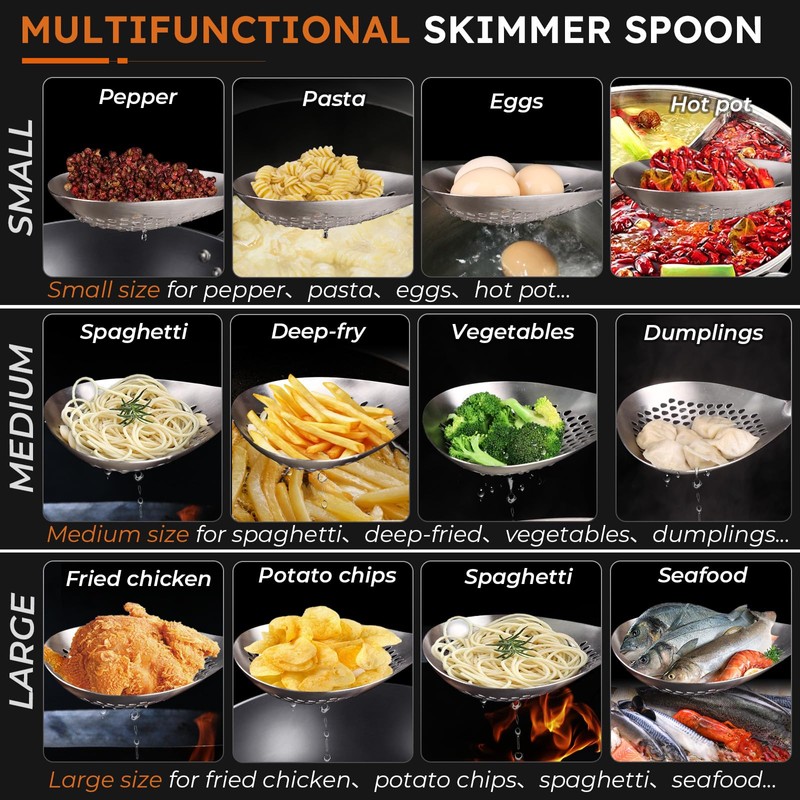 - Multifunction Cooking Utensils - It is ideal skimmer slotted spoon for deep-frying, sautéing, stir-frying and cooking.Perfect for frying foods, like potato chips, French fries, fried chicken, and scooping up eggs, vegetables, noodles, pasta,spaghetti, meat,dumpling, etc