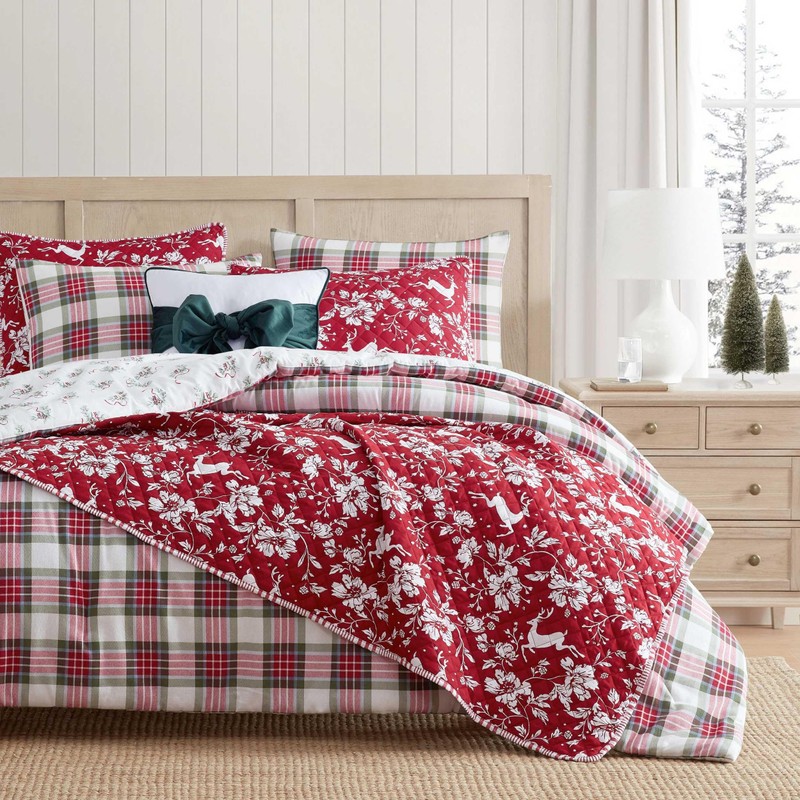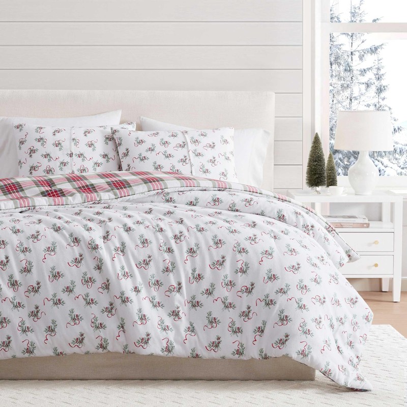 Martha Stewart - King Bedding Comforter Sets, Wonderfully Plush & Naturally Soft Cotton Flannel Bedding w/Matching Pillowcases, 3 Piece Bed Sets (Yuletide Spruce Plaid/Holiday Ribbons Red)
