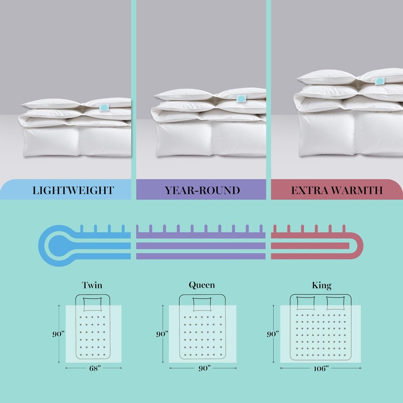 - 【Find Your Perfect One】We offer three sizes and three thicknesses( Light Warmth & All Seasons Medium Warmth & Extra Warmth). Twin (68"x 90"), Queen (90"x 90"), King (106"x 90"), If you're a hot sleeper or transitioning into the warmer months, we recommend trying the All Season Medium Warmth version.