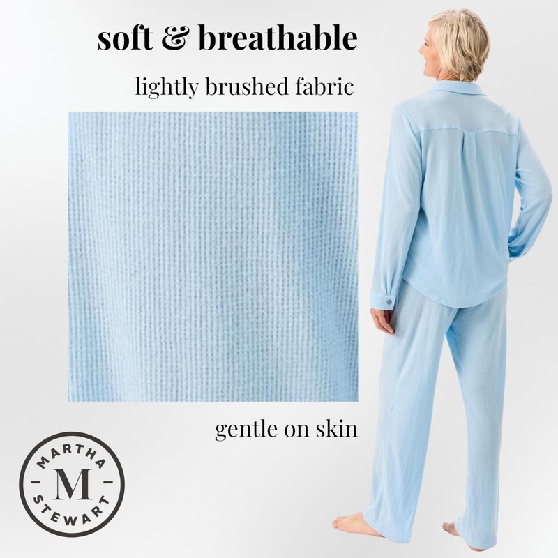 - CLASSIC MARTHA STEWART 2 PC. PAJAMA SET: Enjoy elevated comfort with this women’s 2-piece button-down pajama set, designed under the trusted Martha Stewart brand with style and all-night ease.