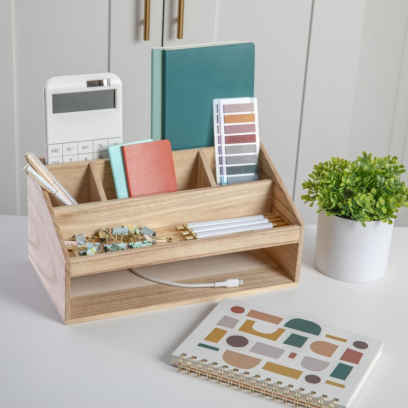 Martha Stewart Weston Wooden Desktop Organizer with Open Lower Storage Compartment, Paulownia Wood Multipurpose Storage Caddy, Light Natural