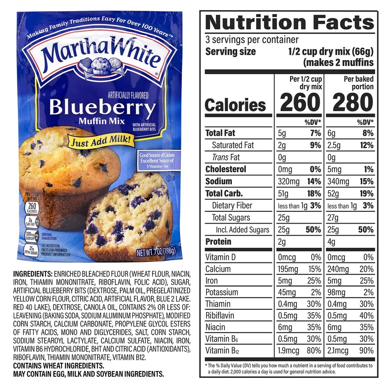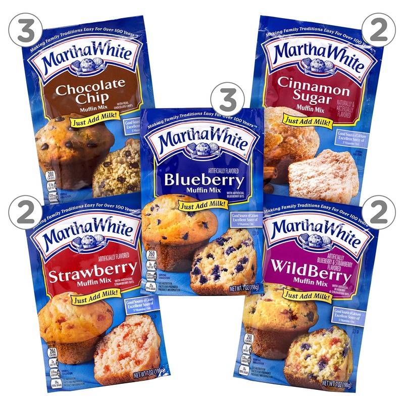 - Kit contains 3 - 7 oz. pouches of Martha White Blueberry Flavored Muffin Mix, 3 – 7.4 oz. pouches Martha White Chocolate Chip Muffin Mix, 2- 7 oz. pouches Wildberry Flavored Muffin Mix, 2 - 7.4 oz. pouches of Martha White Cinnamon Sugar Flavored Muffin Mix, and 2 – 7 oz. pouches Martha White Strawberry Flavored Muffin Mix