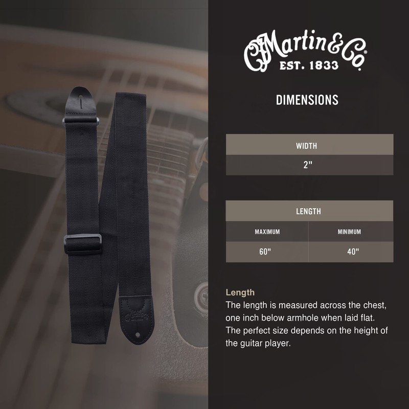 - HIGH-QUALITY ADULT GUITAR STRAP: This Martin Guitar black nylon guitar strap is a comfortable, no-frills strap. It is proof that you don't need to be the loudest to say the most. This strap is soft and comfortable, with an adjustable length of 40" to 60" and a 2-inch width. It has a built-in pick holder, so it’s convenient for when you rock out on stage
