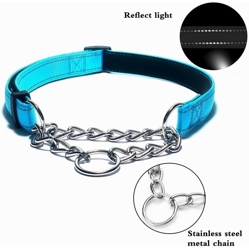 - 🐶 No pull and Safe - reflective martingale dog collar for medium dogs with stainless steel chain. The stainless steel chain can be stretched to relieve tensile force, s dog's neck and your hands will more relaxed. There are reflective lines on the collar. When the dog walks at night , the lights and carlights will make the dog collar have a good reflective effect, making the dog safer at night.