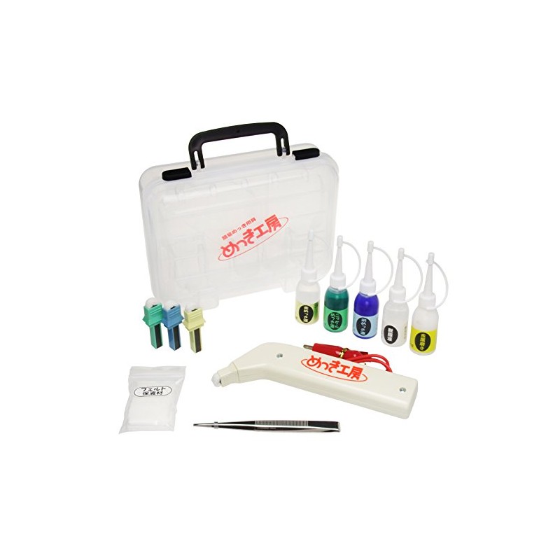 • Set Includes: Plastic storage case / Metal polishing, degreasing liquid, copper, nickel, gold plated liquid, 0.6 fl oz (18 ml) each