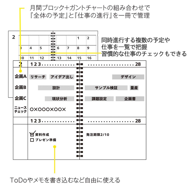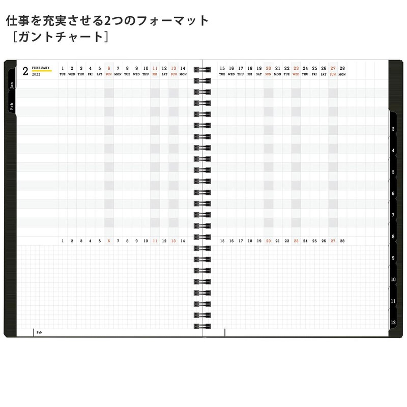 Mnemosyne Monthly Diary 2022 and Mnemosyne square grid A5 sized notepad (N188A) are combined together in a stylish and durable black PVC cover. This monthly planner set includes a handy writing pad to jot down your ideas and take notes while checking on your schedules or your to-do-list on your monthly calendar. Planner opens with your Monthly Diary conveniently on the left and the memopad on the right. Diary can be inserted into the holding belt from either side depending on your preference. When set from the inside, the book becomes compact so you can hold it and work on-the-go. When it's set from the outside, the diary pages can open without overlapping the notepad, which is preferable when working at your desk so you can write in your notepad at the same time. Both the Monthly Diary and the notepad are replaceable. Mnemosyne Monthly Diary has two formats for each month: Monthly view page with daily blocks to easily see your overall plans at a glance and Gantt chart that help you manage multiple jobs simultaneously. Calendar includes January 2022 to January 2023, and each month is separated with a laminated index tabs for easy access. Diary planner is firmly bound with quality double wire binding system, and the pages completely lay flat for easy writing. Maruman's premium quality, 80g/m2 acid free papers are used. Notepad features 70 micro perforated white papers with 5 mm x 5 mm light gray square grid while the back side is blank. It measures 212 mm x 148 mm after detached, almost same as A5 size sheet. Each page has a blank header with DATE/NO. and TITLE for easy organizing. Firmly bound on top with glue & staple, Maruman's premium quality, 80g/m2 acid free papers are made in Japan with their uncompromising commitment to its quality to promise a superior smooth writing with minimal ghosting and bleed-through.