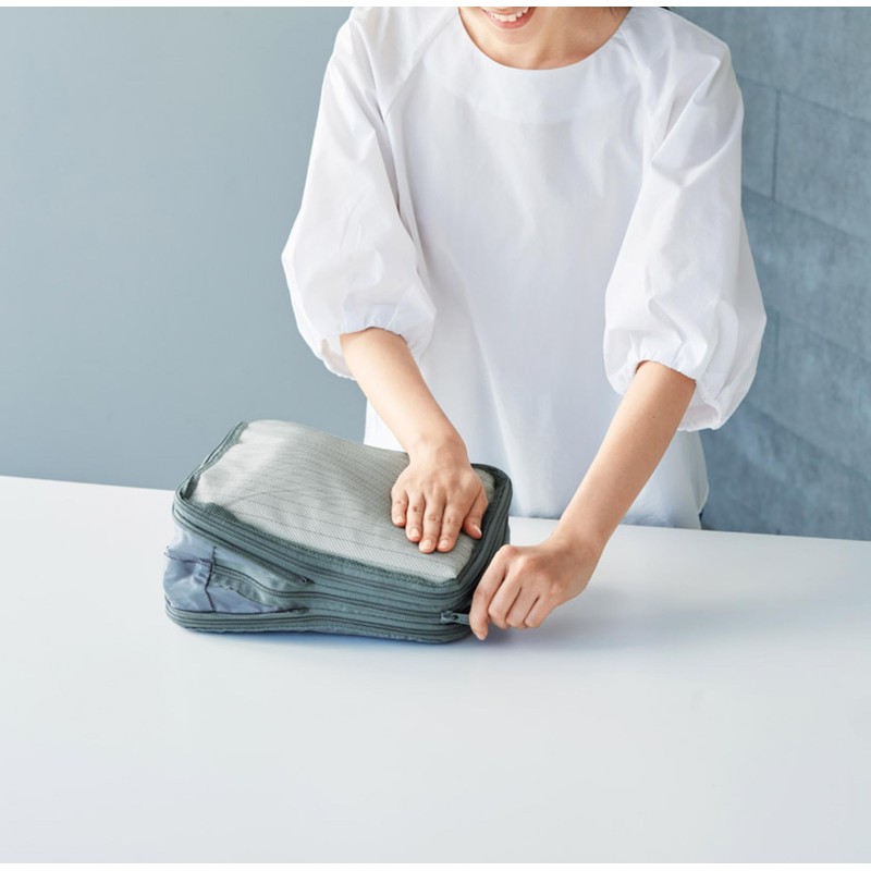 - Size: When stored: Approx. 1.6 x 10.6 x 8.7 inches (40 x 270 x 220 mm), When in use: Approx. 4.7 x 10.6 x 8.7 inches (120 x 270 x 220 mm), Material: Polyester, a compression bag that makes it easy to carry around. The mesh side opens both to reveal the interior and the other side of the bag, so you can separate it from your clothes before and after use