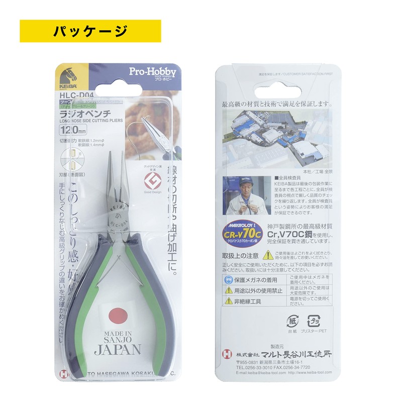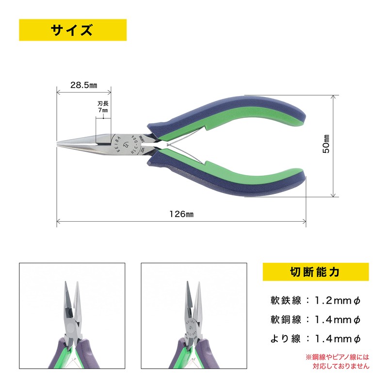 • 線材の切断や曲げ加工に。先端溝付(内面)。先端は挟みやすいクロスセレーション加工。切断刃あり。