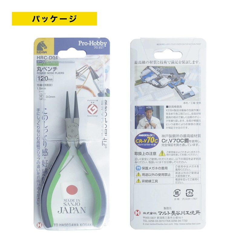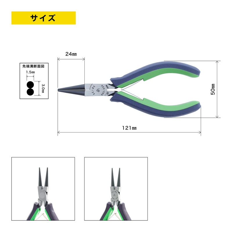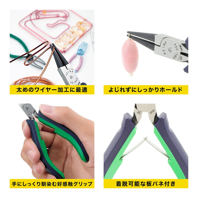 ビーズアクセサリーなど手芸用にも最適9ピンを丸めるなど金具の丸い輪を作る時などに使います。アーティスティックワイヤーの曲げ加工に!・先端の径(円錐型がきちんと合っています)1.5mmφ ・先端が丸くなっており、材料の丸曲げ加工が的確に出来ます。・ステンレスのバネがついていて、しなやかに扱えます。・しっとり感・好感触なエラストマー樹脂グリップ・手の大きさにピッタリの全長120mmの大きさ テレビ番組「和風総本家」にてKEIBA マルト長谷川工作所の工具がヨーロッパの一流職人が愛用する工具として紹介されました