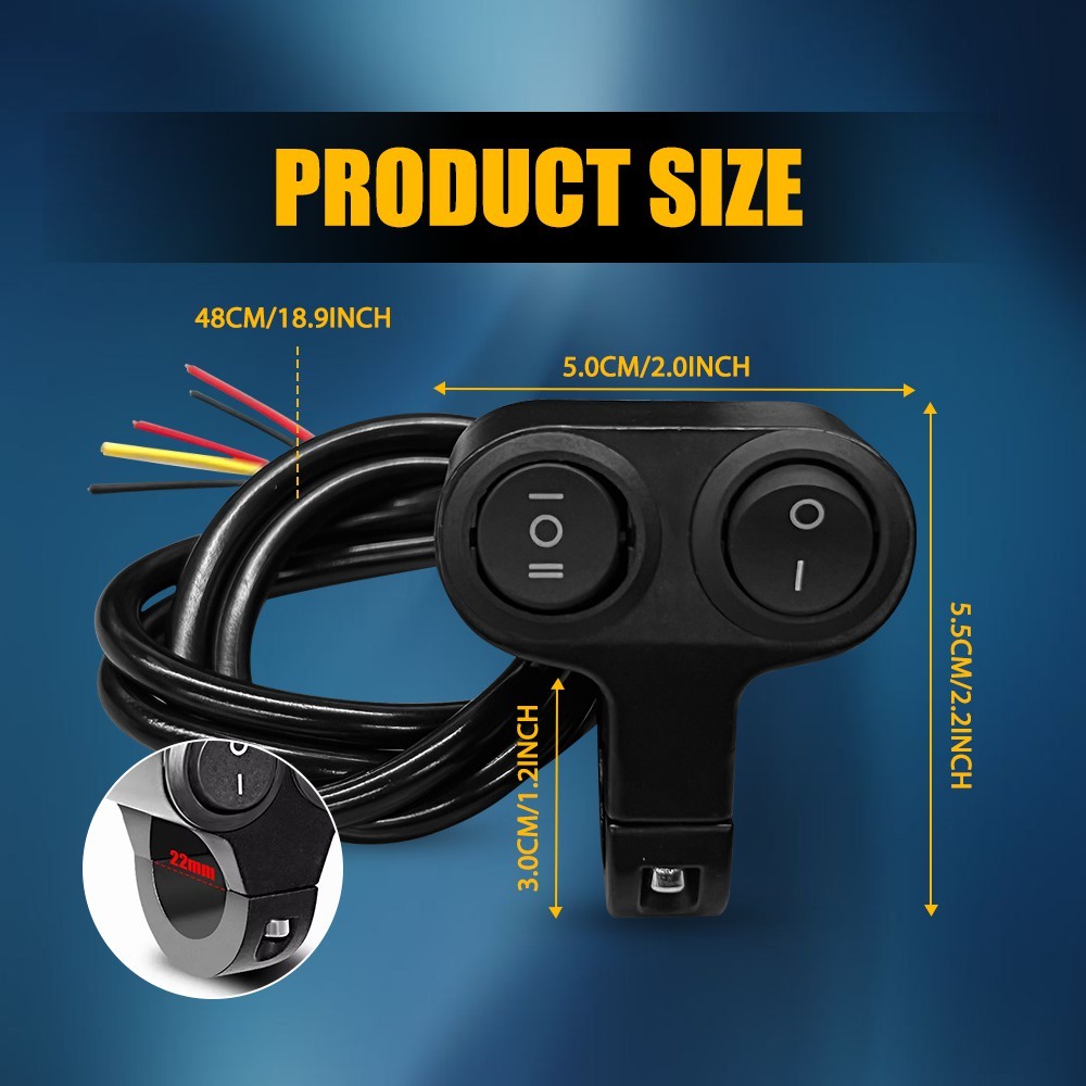 Product Material: Aluminum Product Color: Black Type: Dual button switch on/off (2gears+3gears) Waterproof Grade: IP67 Suitable Handlebar Diameter: 22mm (7/8") Applications: Can be used as a switch On/Off for motorcycle, dirt bike, ATV, car headlights, LED spotlights headlight, fog light, color lights, burst light switches, auxiliary lights, etc.