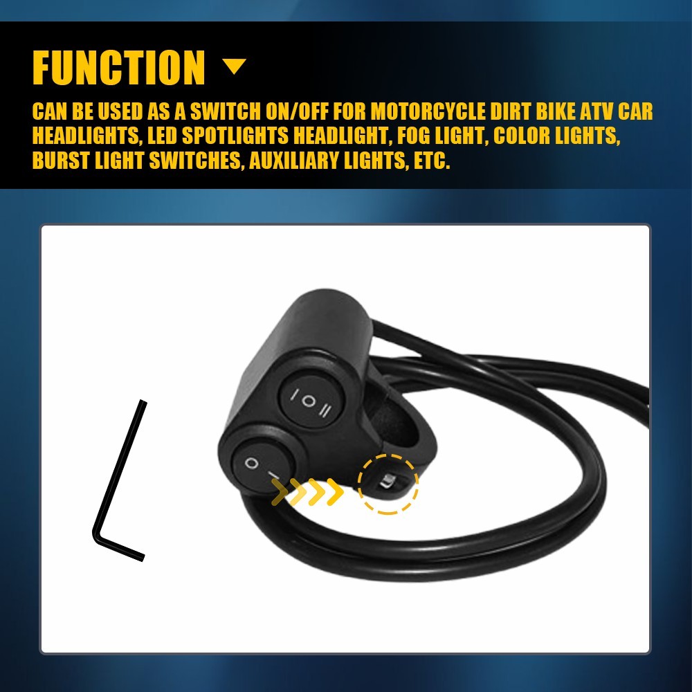 Can be used as a switch On/Off for motorcycle, dirt bike, ATV, car headlights, LED spotlights headlight, fog light, color lights, burst light switches, auxiliary lights, etc.