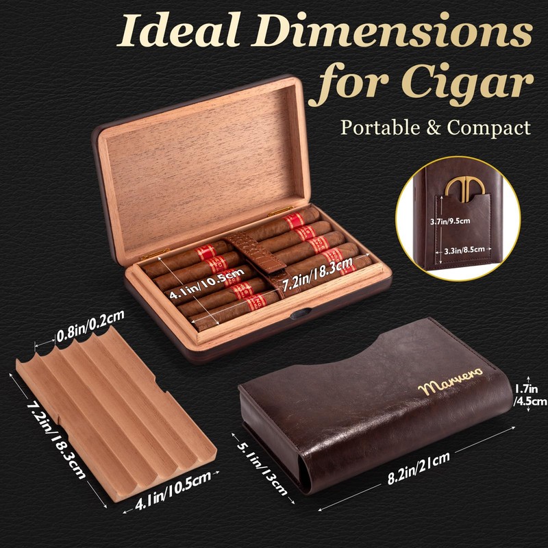 - · [UNIQUE DESIGN]: This walnut cigar case is uniquely designed and stands out as one-of-a-kind in the market (you won’t find anything like it anywhere else). It features an exclusive leather case for easy portability, without taking up too much space in your luggage or backpack. Interior dimensions: 5.5" x 3.4" x 1.1"; exterior dimensions: 6.4" x 4.3" x 1.2"