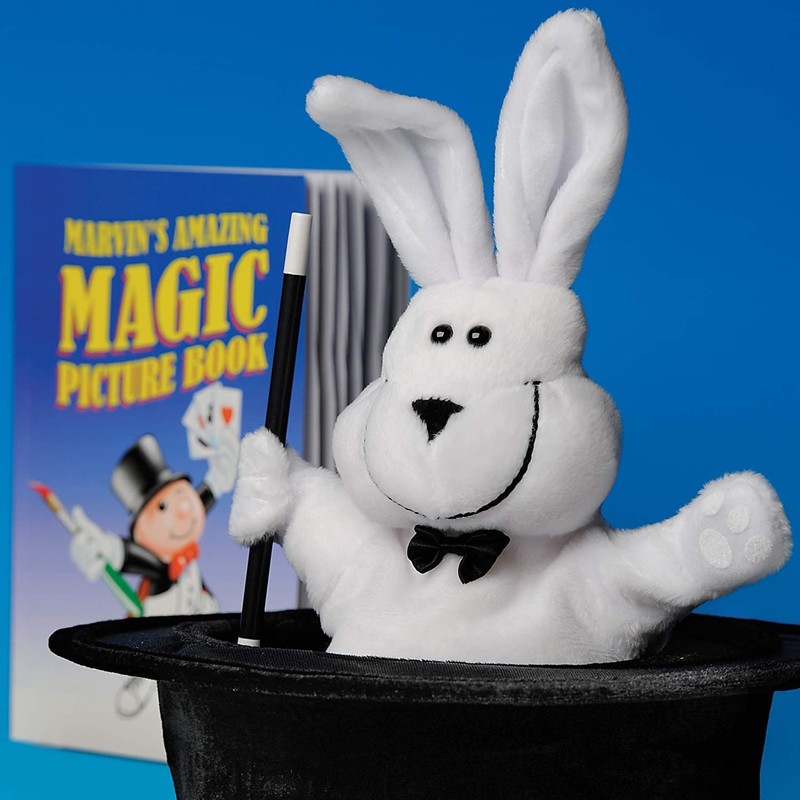 - BECOME AN INSTANT MAGICIAN: The set has been designed specifically with large props for little hands. Let your child become an instant magician with this complete magic set from Marvin’s Magic. As well as a huge collection of tricks and props, the box includes a pop-up top hat, magic wand and a rabbit glove puppet that helps them pull off outrageous illusions. Young magicians really can pull a rabbit out of a hat!