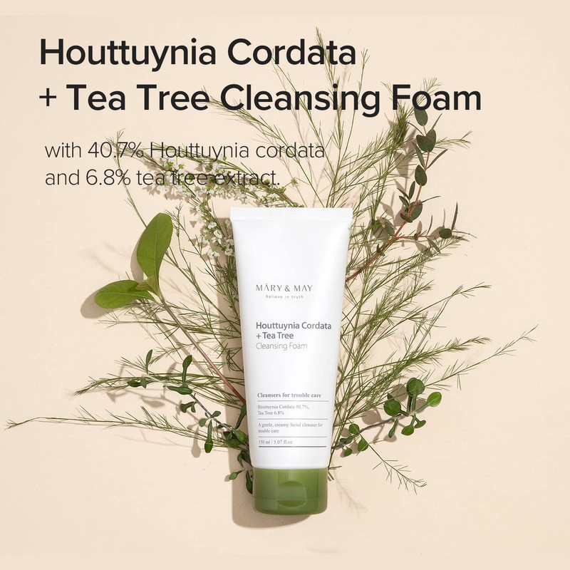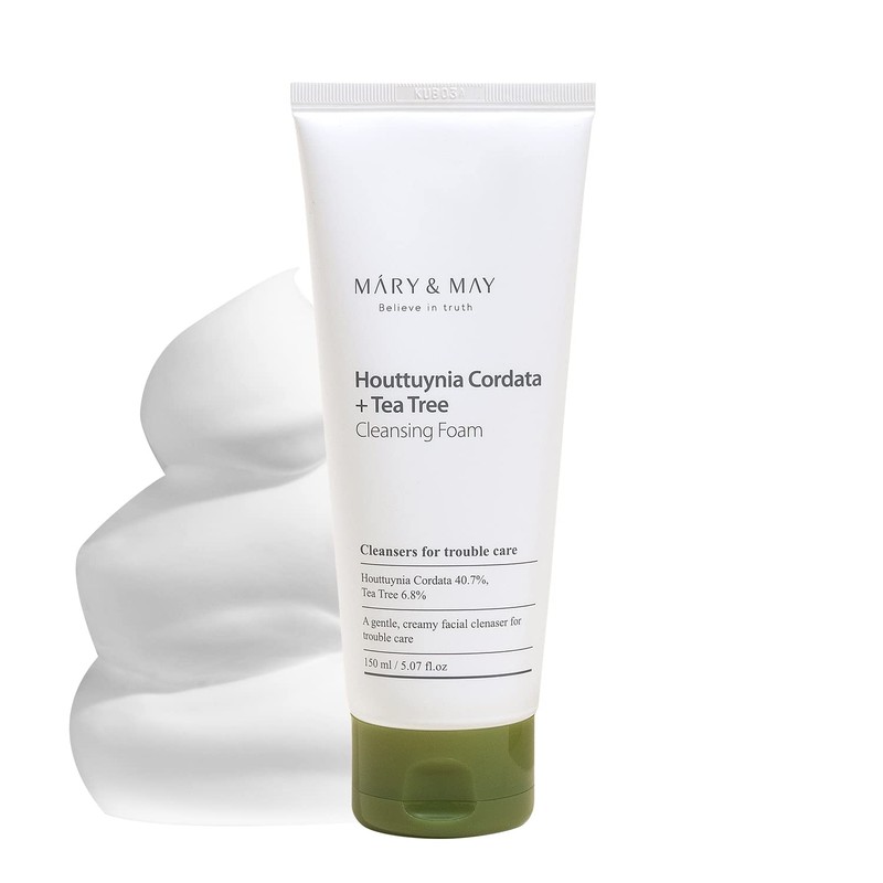 • The Mary & May Houttuynia Cordata + Tea Tree Cleansing Foam is a soft and creamy facial cleanser for blemished and oily skin.