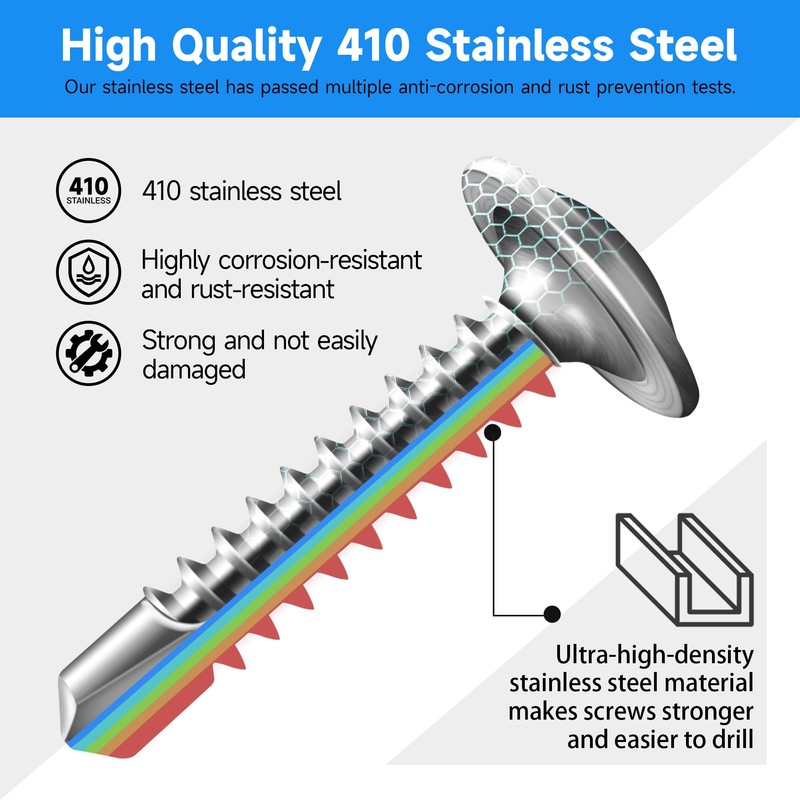 - 【MATERIAL】410 stainless steel, these self-drilling screws offer exceptional performance. Marysino self drilling screws products have undergone rigorous testing to ensure better anti-rust and anti-rust corrosion performance in various extreme environments long-lasting. Please note that 410 stainless steel exhibits weak magnetic properties due to structural transformations.