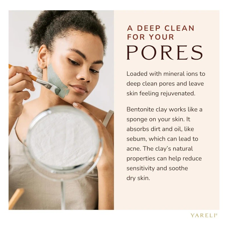 Bentonita de calcio 100% pura: la bentonita derivada volcánicamente (arcilla india) tiene una larga historia de usos terapéuticos como mascarilla facial, jabón de limpieza profunda, aditivo de baño y más; Una limpieza profunda de poros: cargada con iones minerales para limpiar profundamente los poros y dejar la piel rejuvenecida. Observe una piel más suave, poros minimizados, menos brotes y una tez equilibrada en general; Cargado con minerales: el calcio, el magnesio y el hierro de origen natural trabajan juntos para regular la producción de sebo para mantener la piel hidratada mientras ayuda a reducir la piel irritada; Larga duración: el tamaño grande y económico de 2 libras es suficiente para hacer varias docenas de máscaras faciales y hasta 8 baños; Minada en los Estados Unidos: la arcilla de bentonita Yareli se extrae y empaqueta en los Estados Unidos en una instalación certificada por la FDA utilizando prácticas de fabricación sostenibles Todos nuestros productos estan en inglés SKU 100625018045
