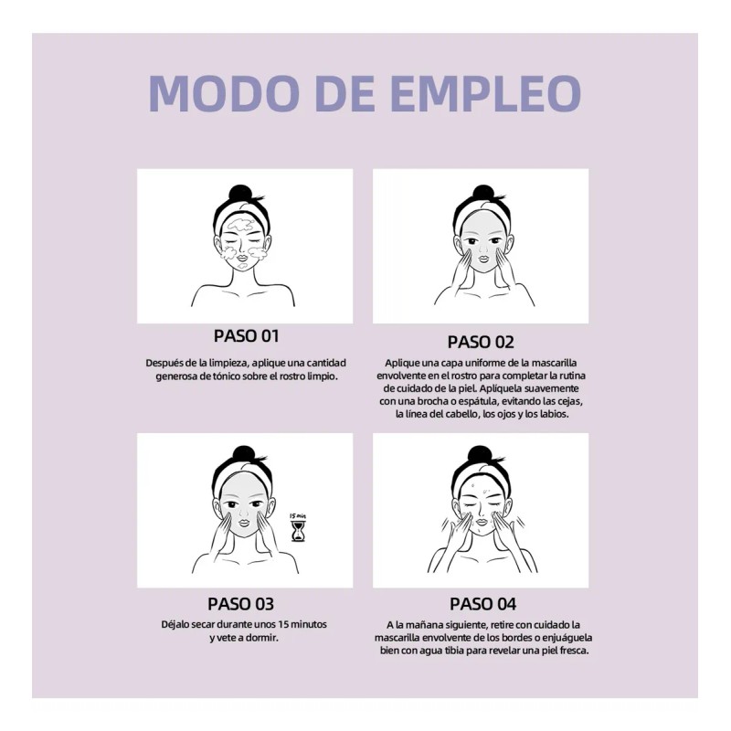 La aplicación es tan sencilla como placentera: simplemente limpia tu rostro, aplica un tónico y utiliza el práctico cepillo de silicona incluido para extender la mascarilla de manera uniforme. 🌿 Por la mañana, retira fácilmente y prepárate para deslumbrar con una piel renovada. 🌞