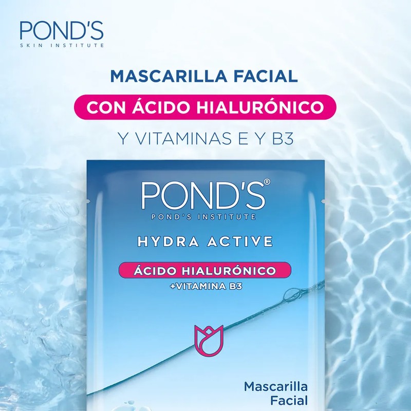 Dale a tu piel un shot de hidratación con la Mascarilla Facial POND'S 💧. Enriquecida con Ácido Hialurónico y Vitamina B3, hidrata profundamente y devuelve la luminosidad a tu rostro en minutos. ✨