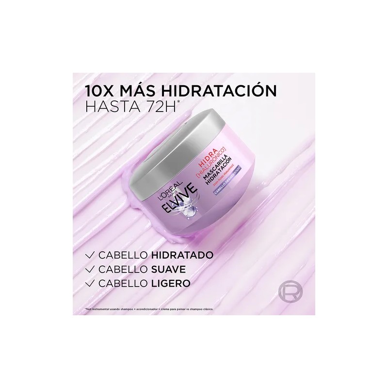 Consigue hidratación profunda hasta por 72 horas. Mascarilla con ácido hialurónico que deja el pelo ligero y con movimiento.