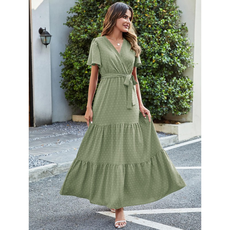 MASCOMODA Dresses for Women 2025 Short Flutter Sleeve Tiered Maxi Dress Swiss Dot Solid Color Wrap V Neck Long Dresses with Belt