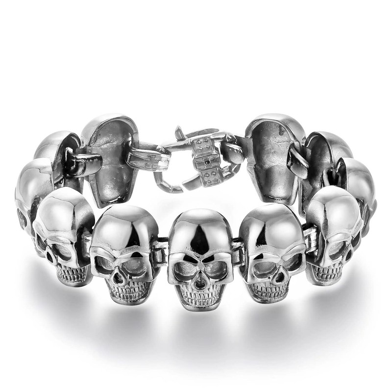 Masculine Stainless Steel Vintage Skulls Link Chain Bangle Bracelet, Cross Spring Hook Clasp, Mens Gothic