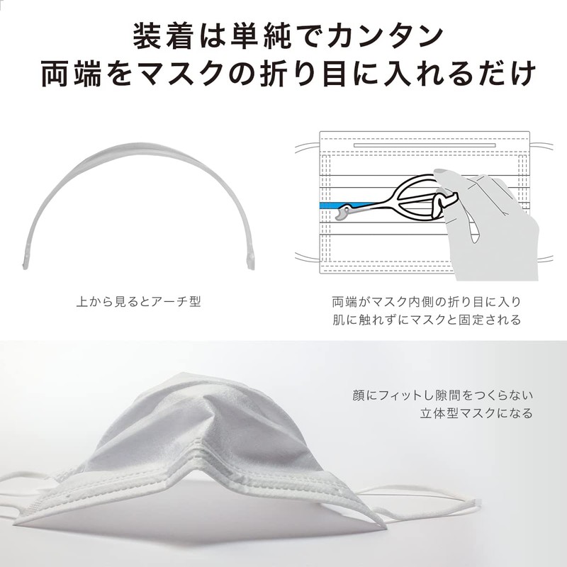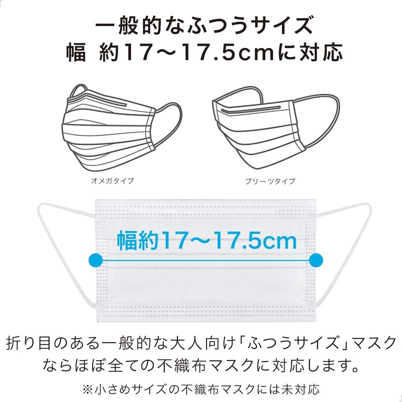 - 【適用マスクサイズ】一般的な「ふつうサイズ」の不織布マスク(3段プリーツマスク、オメガタイプマスク)に対応しています。不織布マスクの幅は 17~17.5cmに装着できます。マスクの裏側、折り返し部分の溝にライフマスクサポーターのアームの端を挟み、アーチ型にしなることで3Dの空間を作り出す構造になっています。湿ったマスクが鼻や口にピッタリくっつくのを防ぎ、快適に息がしやすくなるように設計されました。(小型、小さめマスクには装着できません。別途ライフマスクサポーターの小さめサイズをお求めください)