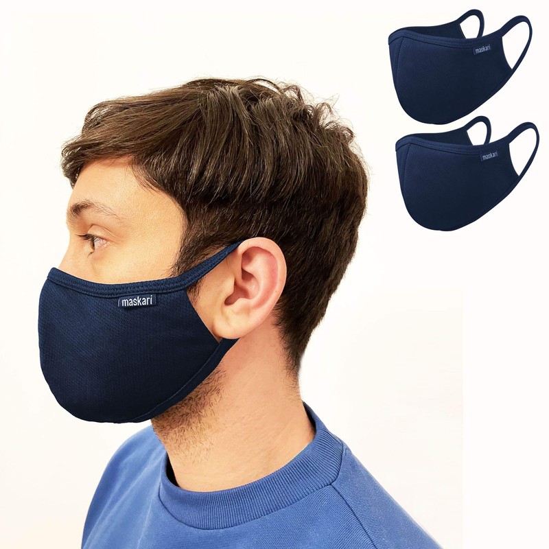 Maskari Navy Blue Reusable Face Mask | Washable | 3 Layer Face Masks | Adjustable Earloops | HeiQ Viroblock | Breathable | Ideal for Men | Pro 2 Pack, Large