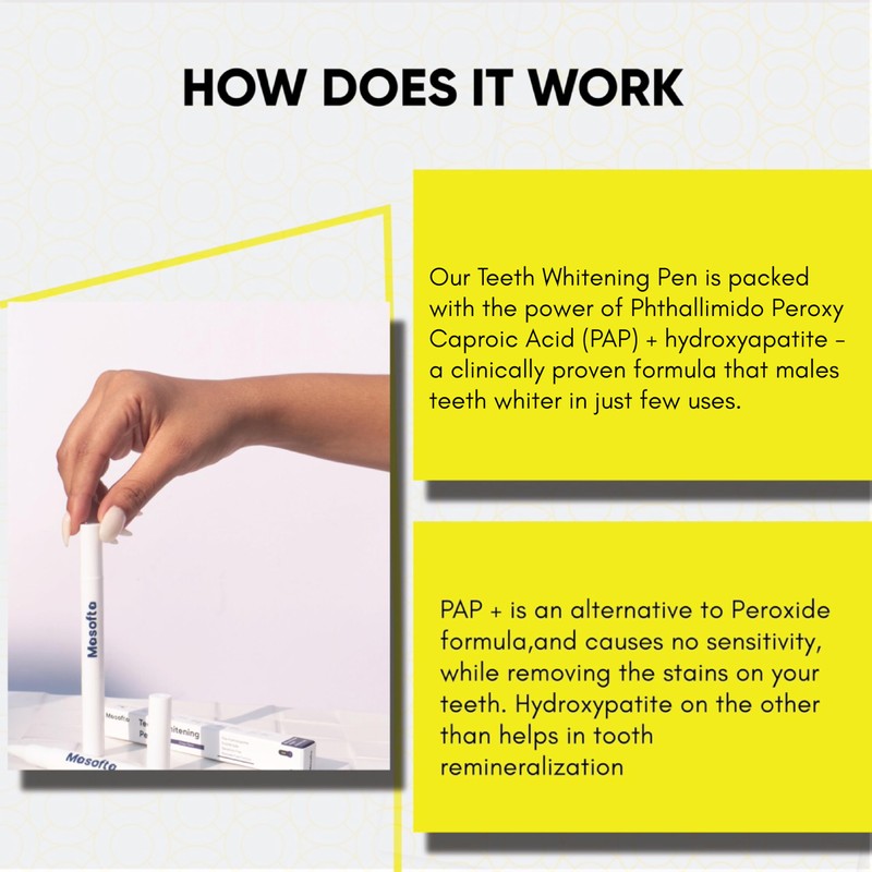 Unleash the power of brilliance with our Teeth Whitening Pen – a sleek and effective solution for yellow and dark stains on your teeth. This pen is not just a tool; it's your daily companion on the journey to a brighter, more confident you. It's packed with the power of Phthalimido Peroxy Caproic Acid (PAP) + hydroxyapatite - a clinically proven formula that gently removes those sneaky stains from your teeth by oxidising them. Say goodbye to coffee or tea stains – this pen can handle them all. Pap is an alternative to Peroxide formula, and causes no sensitivity, while removing the stains on your teeth. Hydroxypatite on the other hand helps in tooth remineralization.