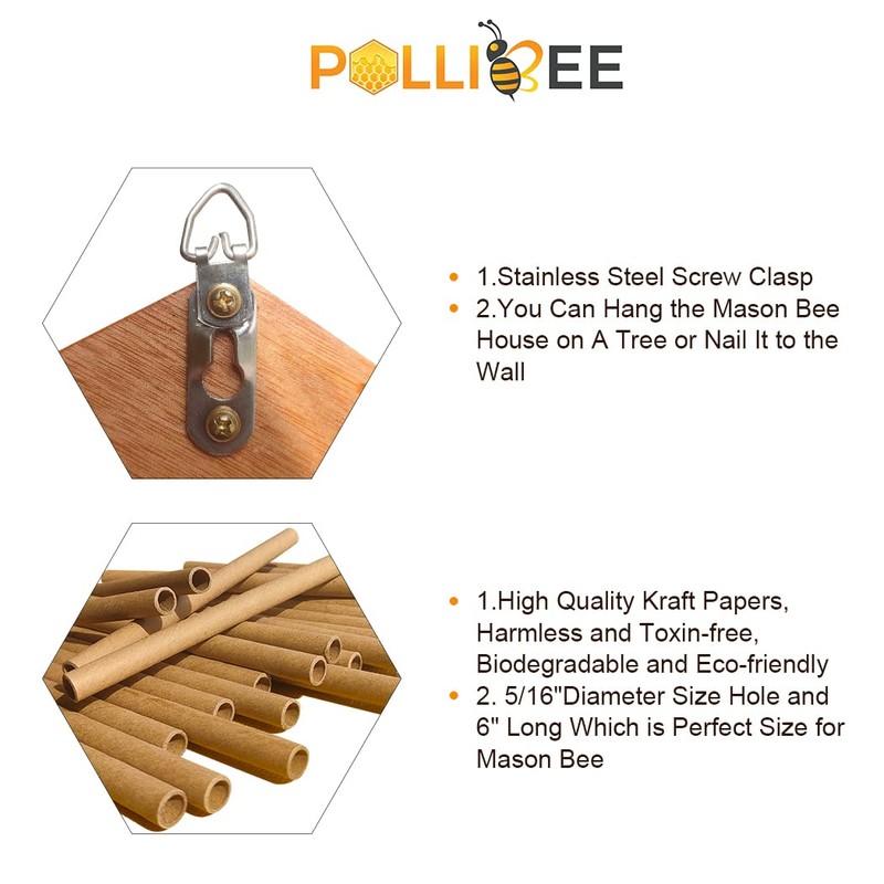 Mason bees live in houses called nests, 6 inch in deep and 5/16” in diameter is the size that preferred by mason bees. POLLIBEE Mason Bee House meets all the requirements.