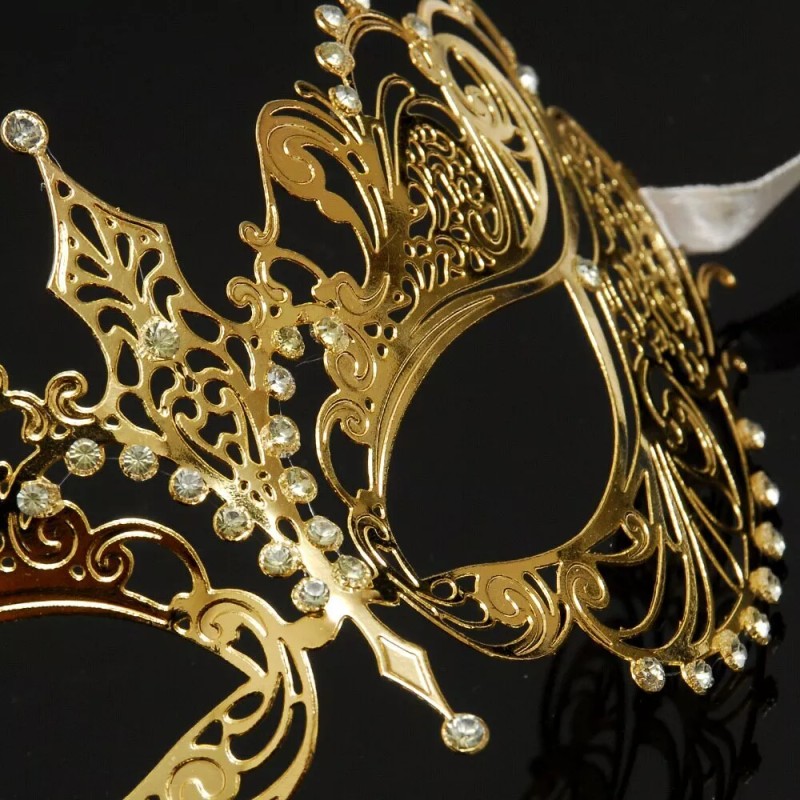 Materials/Techniques: Quality filigree metal mask with rhinestones - fully adjustable ribbon ties for comfortable wear.