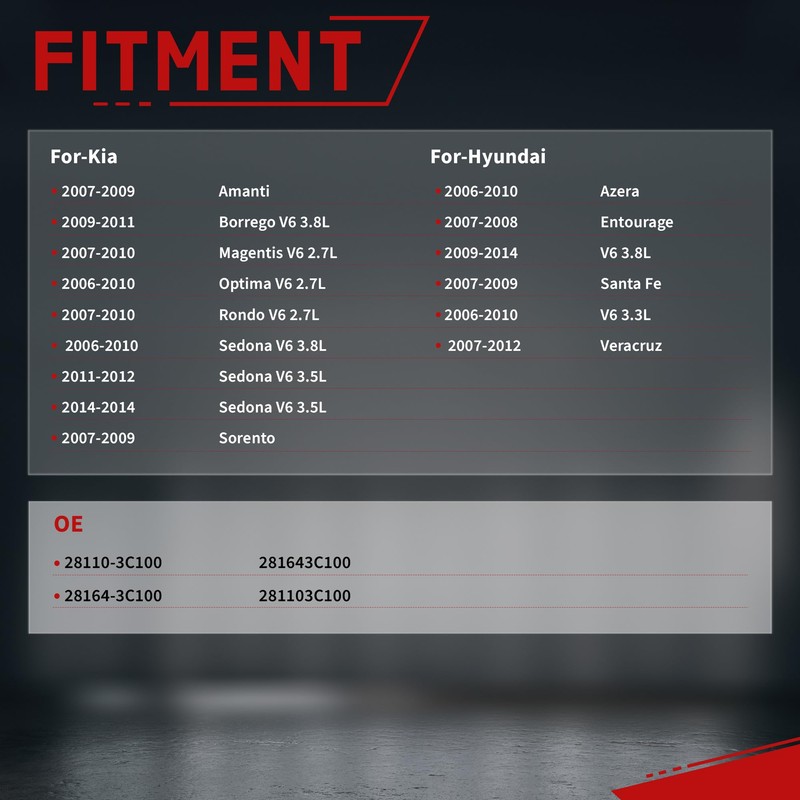 - 【Fitment】For-Kia 2007-2009 Amanti, 2009-2011 Borrego V6 3.8L, 2007-2010 Magentis V6 2.7L, 2006-2010 Optima V6 2.7L, 2007-2010 Rondo V6 2.7L, 2006-2010 Sedona V6 3.8L, 2011-2012 Sedona V6 3.5L, 2014-2014 Sedona V6 3.5L, 2007-2009 Sorento; For-Hyundai 2006-2010 Azera, 2007-2008 Entourage, 2009-2014 Genesis V6 3.8L, 2007-2009 Santa Fe, 2006-2010 Sonata V6 3.3L, 2007-2012 Veracruz