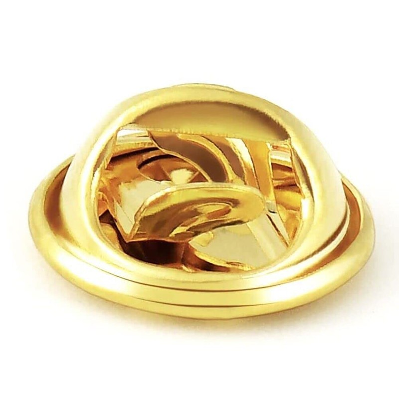 Measures 0.50” Diameter Our pins are die struck from jeweler’s metal, soft enamel color filled, and epoxy coated. Pin fastens with what is known as a butterfly clutch which is one of the most popular modern methods of attaching pins, also known as a military clutch. The back of the pin has a small prong attached and when the butterfly clutch is squeezed and pulled up from the prong the pin is released from the clutch.
