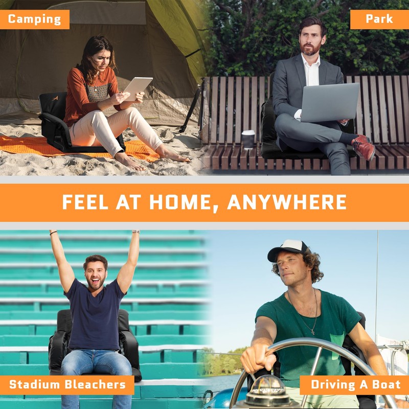 - FEEL AT HOME, ANYWHERE - Our heated seat is 20” wide, has a waterproof bottom and water-resistant construction to keep you nice and dry when the bleachers are wet. It comes with high-density memory foam cushions that feel like sitting on your couch. What’s more, our seat offers 6 adjustable reclining positions, back support and soft padded armrests.