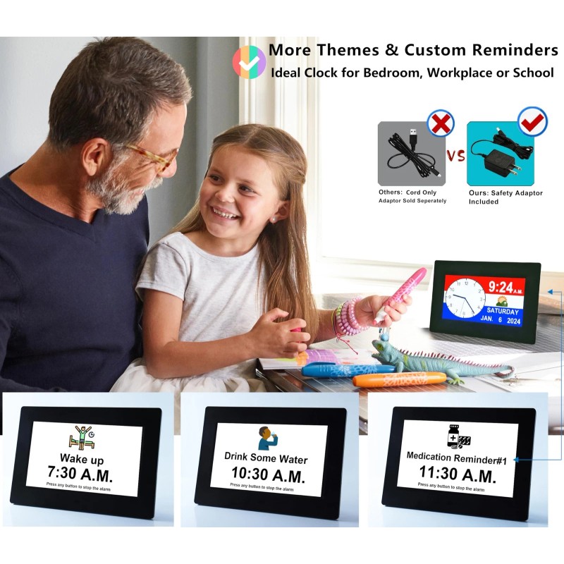 Why do I say this is the best gifts choice among the clocks for the seniors? For the elderly parents, as they grow older, their memory and vision gradually deteriorate, and the blurring of the concept of time will cause them to forget many important days, which will gradually make them anxious. And our clocks are equipped with 7 inch large 720P HD screen and letters, which can fully display the time, year, month and day. It also has colored Sun/Moon image icons to indicate periods of day and night time, Helping to relieve their anxiety.