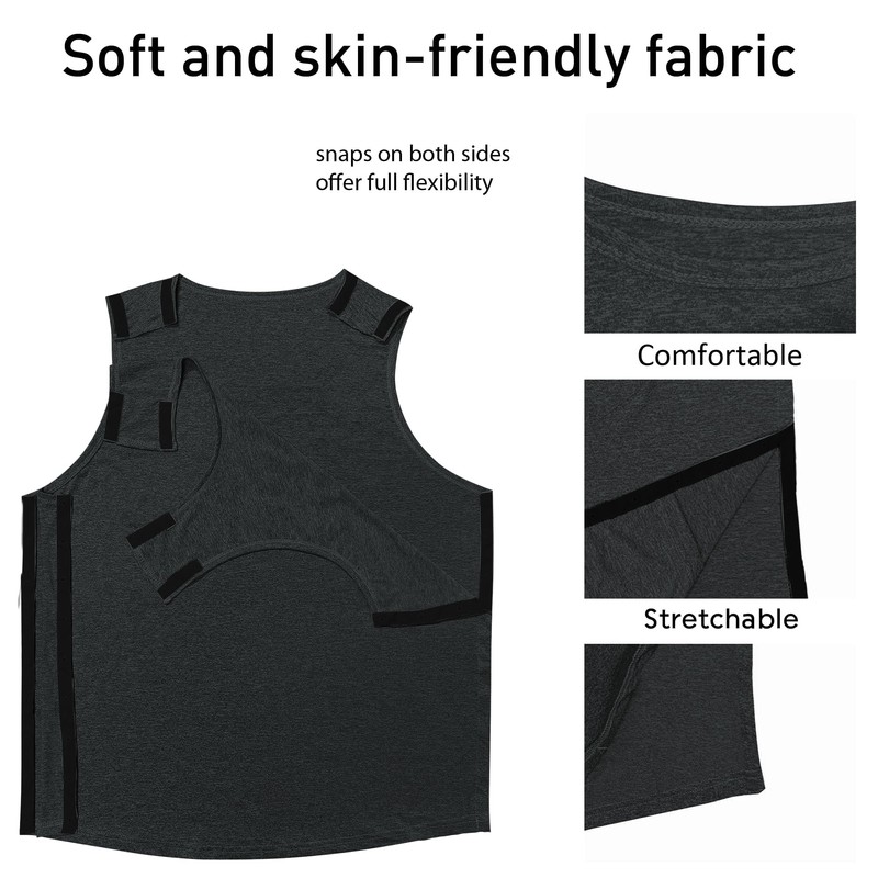 Mastectomy Recovery Tank Top with Drain Pockets Unisex Post Shoulder Surgery Shirts Full Snap Access Rotator Cuff Recovery Clothing Dark Grey L