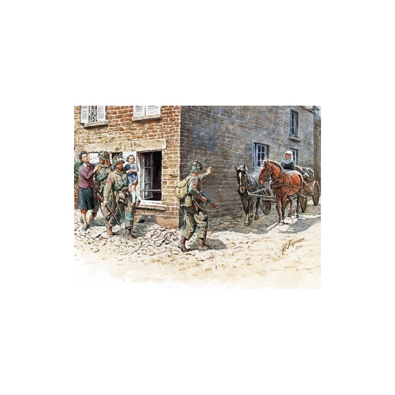 Master Box Models 1/35 "France 1944" - 5 Figures Set (3 U.S. Paratroopers, A Girl, Mother And Nun) With 2 Horses And French Telega