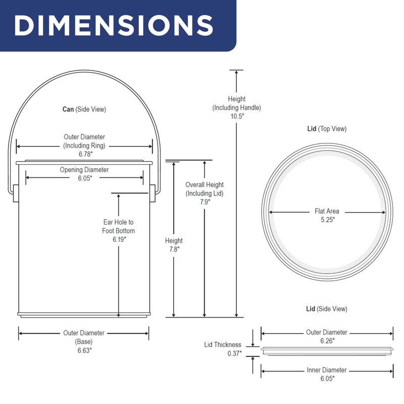 - These Master Elite Brand all-plastic paint cans have a recycled polypropylene body with a friction-fit polypropylene lid and handle. Each lightweight leak-resistant plastic can bucket contains a snap-on lid, ears, and an ergonomic plastic bail handle for easy pouring and transport. Approximate can dimensions: 6.63" diameter x 7.9" high with the lid on.