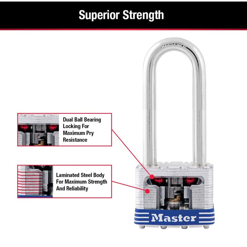 The Master Lock No. 1TRILJ Laminated Padlocks feature a 1-3/4in (44mm) wide laminated steel body for maximum strength and reliability. The 5/16in (8mm) diameter shackle is 2in (51mm) long and made of hardened steel, offering extra resistance to cutting and sawing. The 4-pin cylinder prevents picking and the dual locking levers provide resistance against prying and hammering. The Limited Lifetime Warranty provides peace of mind from a brand you can trust.