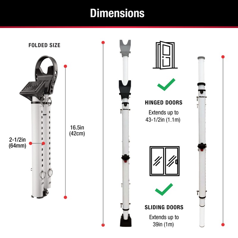 - Door security bar features innovative folding design for compact storage and portability, Adjusts from 25-1/2in to 43-1/2in for use on most hinged and sliding doors