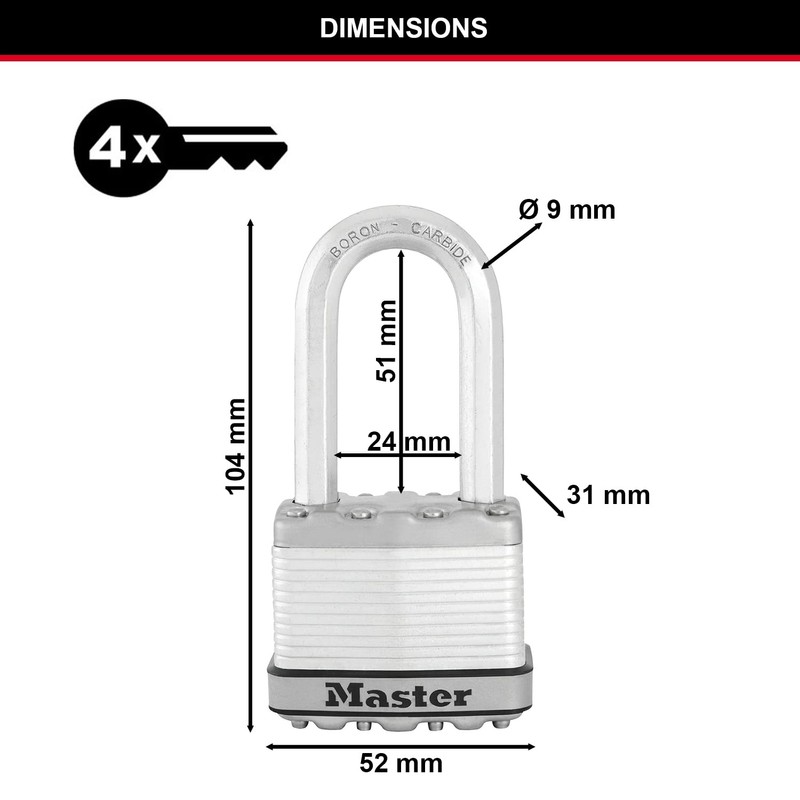 MASTER LOCK Very High Security Padlock, Security level 9/10, Outdoor, Keyed, Laminated Steel, Weatherproof, Medium Shackle