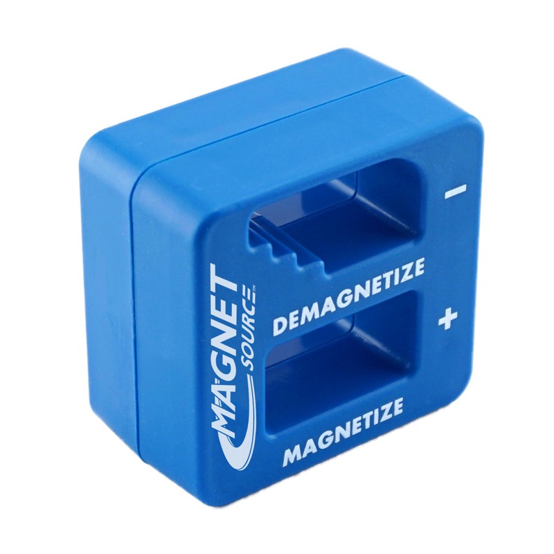 Quickly and easily magnetize small tools for holding, starting and removing fasteners. To magnetize, slide tool in and out of the (+) opening. To demagnetize, slide tool in and out of the of the (-) opening along the lowest step. If still magnetized, repeat along higher step until magnetism is gone.