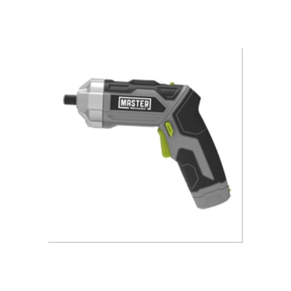 - Master Mechanic 4V lithium-ion cordless screwdriver, internal 1.5Ah lithium-ion battery, 1/4' hex drive with auto lock, 1 speed reversible, variable 180 RPM. Max torque 35 IN-LBS, LED work light with independent on/off switch. Flashlight in base, 90 minute USB charger, battery indication lights, soft rubber grip. Pivoting handle locks to straight or 90 degrees. Includes 20 bits: 20pcs 25mm bits: PH1, PH2x 2, PH3, PZ1, PZ2x3,PZ3, H3, H4, H5, H6,T15, T20, T25, T30,S4, S5, S6 packed in a clamshell.