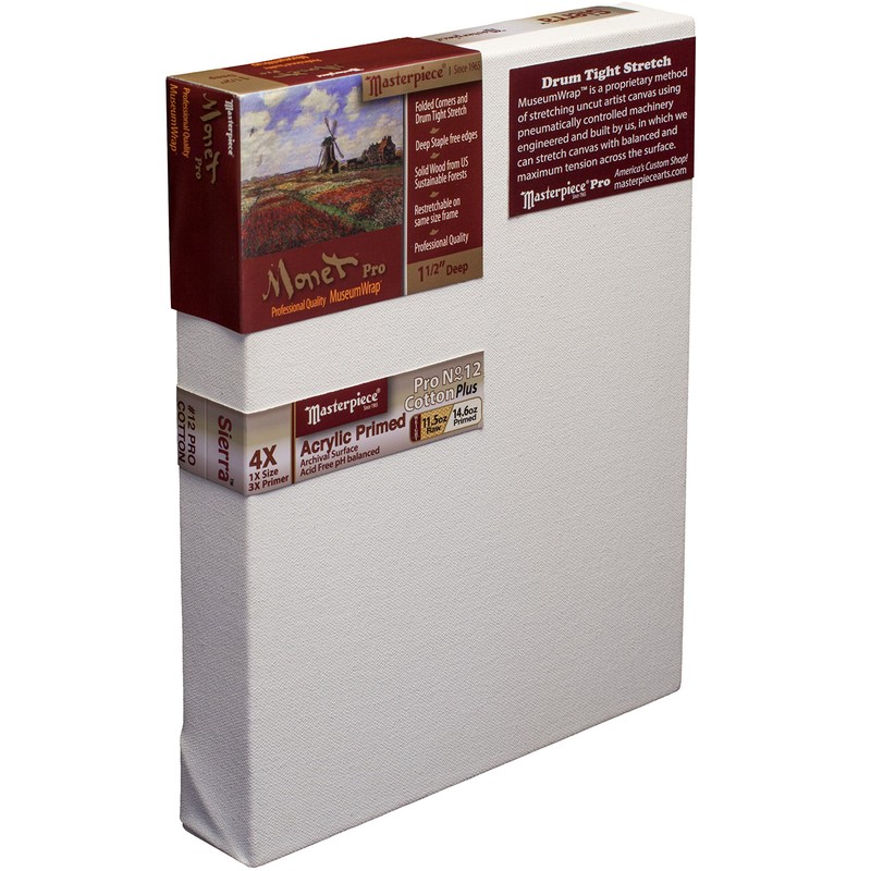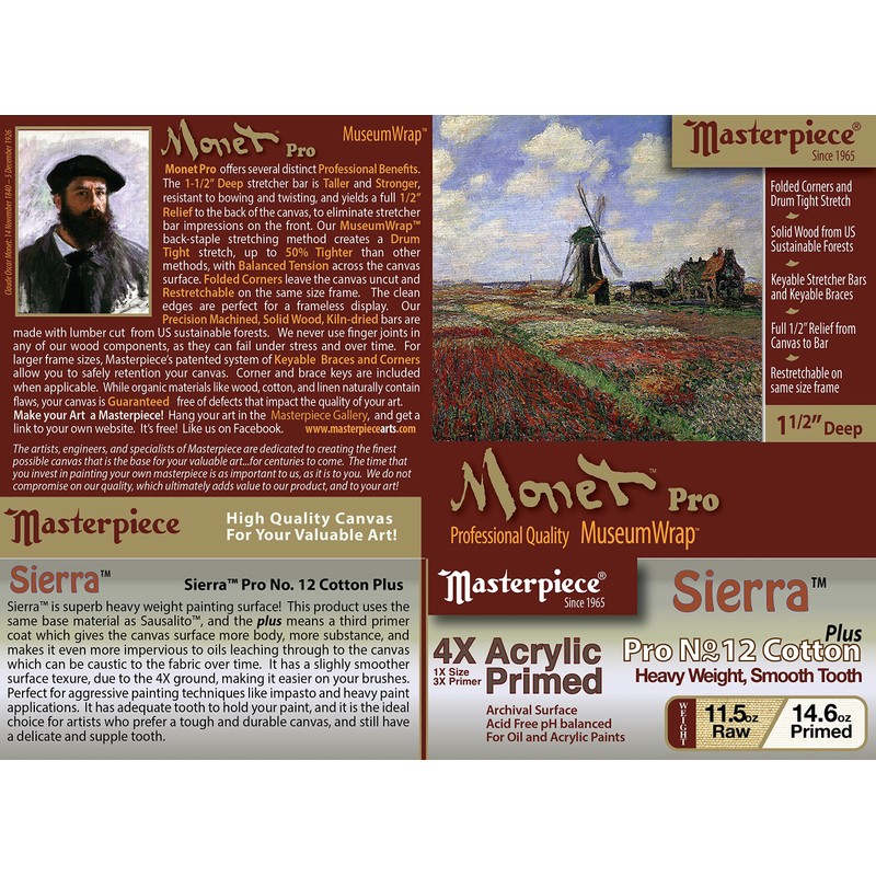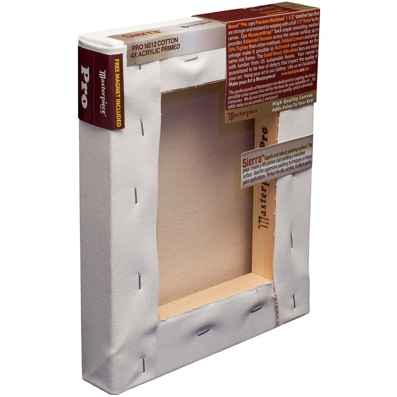For 50+ years, the passion of the Masterpiece team is building the finest artist canvas in America. Just touch one of these impressive products and you’ll immediately discern the quality characteristics that separate this canvas from any other. Masterpiece takes pride in using high quality materials, employing unparalleled workmanship, and continually upping the bar on quality. The importance of artists using a quality made canvas cannot be overstressed. If you use high quality paints and brushes, then don’t waste your resources on an inferior canvas not worthy of your own time, talent, and reputation.Masterpiece canvases are built to last well beyond the artist's lifetime…into the next millennium. Savvy art buyers and art enthusiasts understand that the value of a painting increases when the materials used to create it are of equal quality to the artwork itself. Using a well-made canvas is an investment in your own legacy.Why are Masterpiece canvases so good? It starts with the canvas itself. Natural fiber canvas materials, like 100% cotton and Belgian Linen, are selected and inspected. A sizing is then applied to the canvas that becomes a barrier between the ultimate primer and the canvas material. The primer is specifically designed to provide the ultimate surface upon which your paints will join with the canvas, either chemically and/or mechanically, providing a reliable base or ground for your art.The canvas is then mounted onto a state-of-the-art Monet Pro frame. When frame sizes are 16” or larger, a brace is applied to the frame; for example, a 16x20 has a single brace, and a 20x20 is cross braced in both directions. The braces prevent the stretcher bar frame from bowing-in so the canvas stays tighter….which is a welcome feature when you paint on the canvas, making the surface more responsive to the artist’s touch. And the canvas stays tight after it’s painted. To increase the tension further, press-in the corner keys and the brace keys further into the slots, which adds tension in the corners and the middle of the canvas, where the tension is needed the most!Monet Pro canvas is MuseumWrapped, which is Masterpiece’s proprietary stretching technique that achieves: a drum-tight stretch, balanced tension across the canvas surface, neatly folded un-cut corners, and paintable edges. It’s the absolute best way to stretch a canvas.When your art matters, choose Monet Pro…a truly professional canvas in every way!