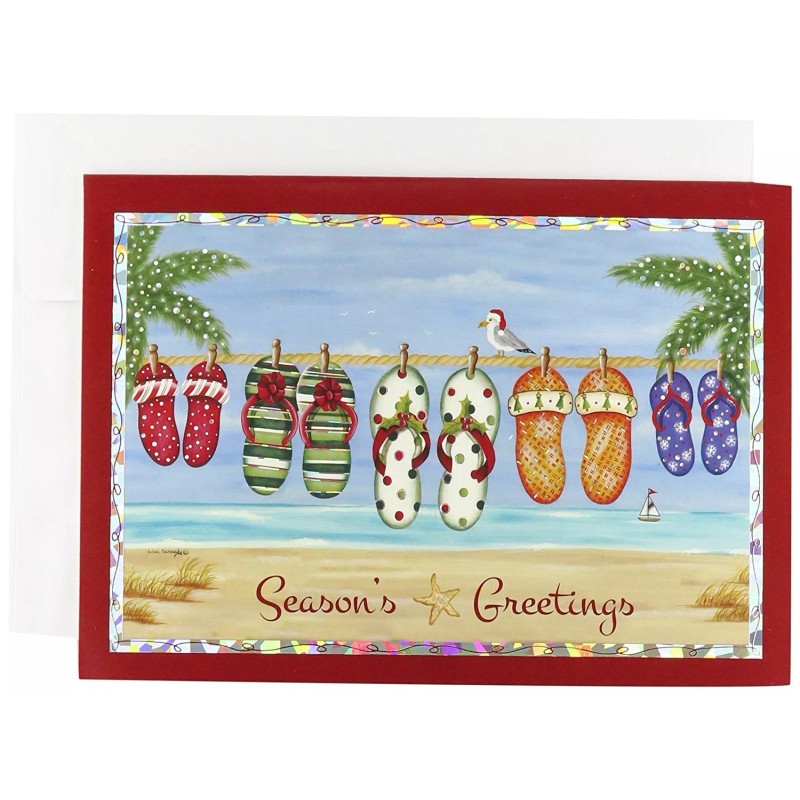 Masterpiece Studios Christmas Holiday Greeting Cards Box 18 Flip Flops On Clothes Line Beach Ocean