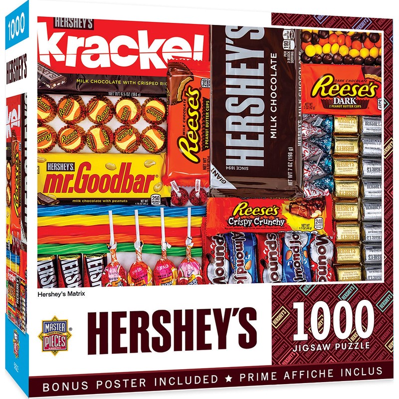 Style:Hershey's Matrix Standard Puzzle Product Description This MasterPieces 19.25 inch x 26.75 inch 1000 piece Hershey's puzzle is full of indulgingly sweet images of a variety of Hershey's chocolates, and are made with the chocolate lover in mind. These puzzles are the perfect gift for any sweet-toothed friend or family member. To reduce its impact on our environment, the chipboard used in this puzzle is made of recycled material. From the Manufacturer For over 20 years, MasterPieces has enjoyed making quality jigsaw puzzles, games, toys & Works of Ahhh craft kits. Innovation and premium quality is the MasterPieces hallmark. Our puzzles are made from recycled paper and soy based inks. Green is not just a color, it’s a commitment.