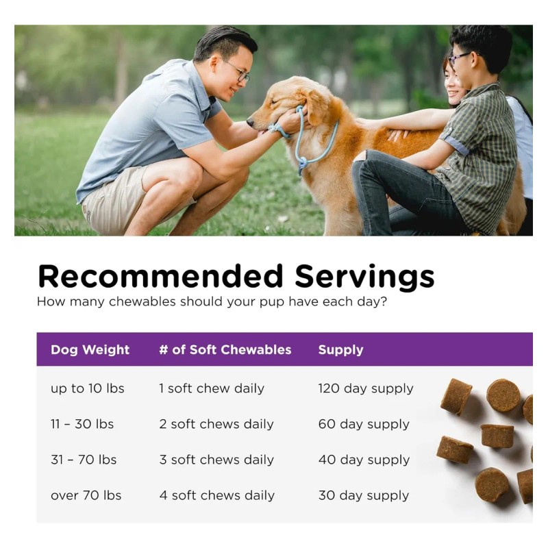 Administrar la dosis diaria recomendada según el peso del perro. Se puede dar como premio o mezclar con su alimento. Para mejores resultados, se recomienda el uso continuo.