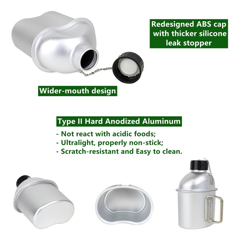 - 🐶 The canteen kit is made of Type II Hard Anodized aluminum, it offers greater corrosion protection and resistance to wear. Unlike raw aluminum used by others, it will not react with acidic foods. It is also well known as an ultralight, properly non-stick, scratch-resistant, and easy to clean.