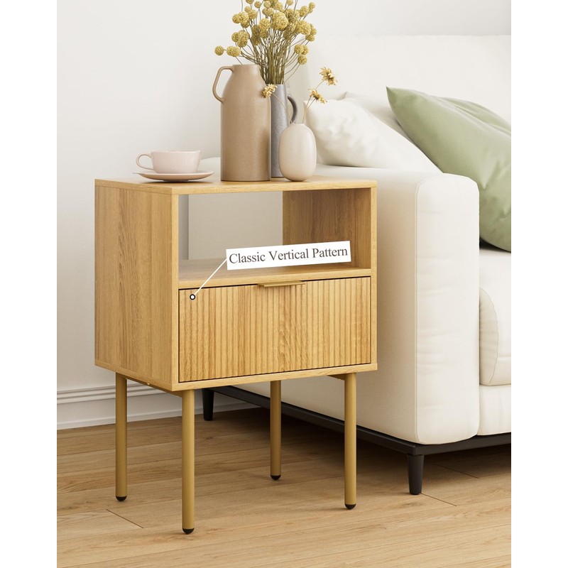 Masupu Night Stand,Mid-Century Modern Bedside Table with Storage Drawer and Open Wood Shelf,Small Gold Frame Side Table for Bedroom,Living Room, Natural