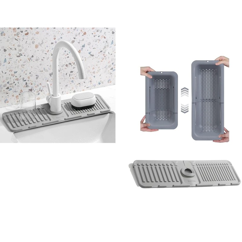 - (Versatile and Durable): The Faucet Mat is made from 100% food-grade silicone. It is designed with a universal fit, allowing you to trim it to perfectly match most standard faucets and is built tu endure regular uses. The Draining Mat is made from plastic of BPA Free material, which means it is safe to filter hot food. It's also highly durable, and heat resistant up to 212° F/100° C.
