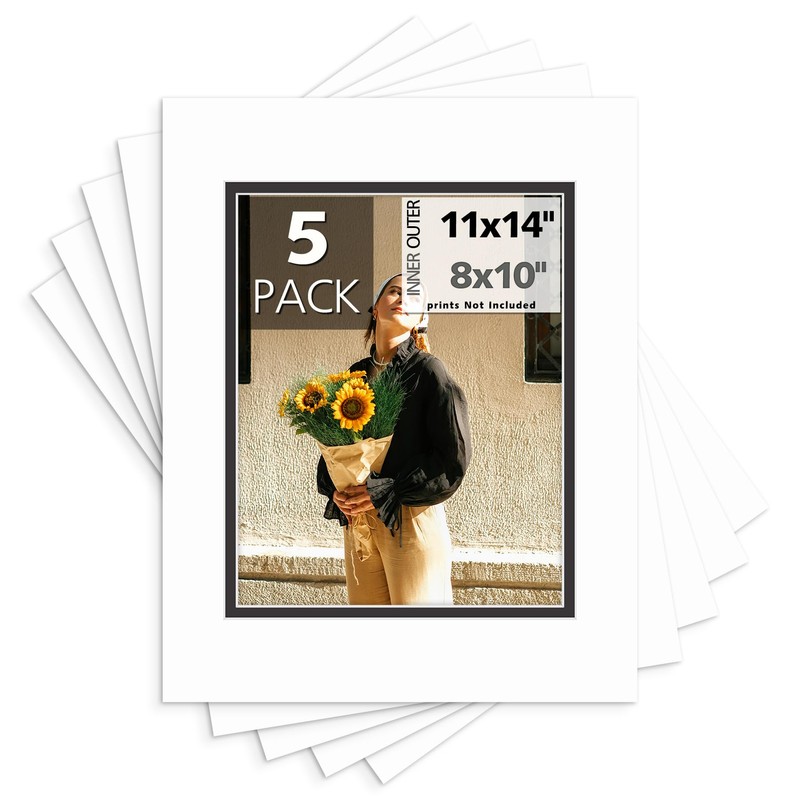 Mat Board Center, Double Mat - Acid Free, 8-ply Thickness, White Core - for Pictures, Photos, Framing (White Over Black, 11x14 for 8x10, Pack of 5)